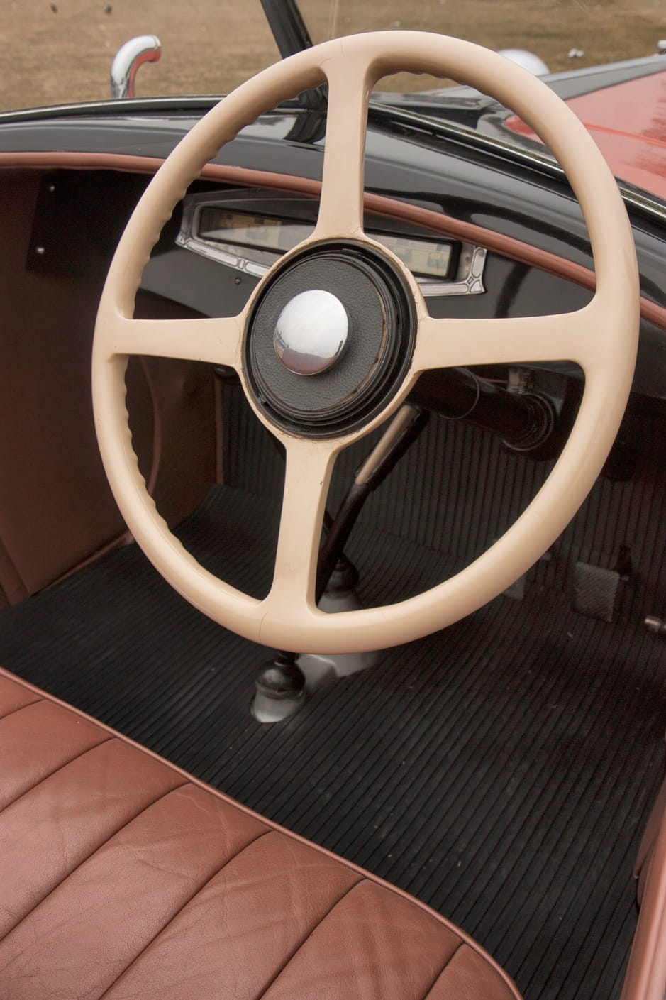 The car’s bodywork is both distinctive and elegant. With the sill plates missing, the identity of the coachbuilder long remained uncertain. However, comparison with period images of a Dilambda bodied by Pinin Farina suggests a strong stylistic connection: the swage lines and detailing are remarkably similar. The most notable difference lies in the dual-cowl arrangement seen in the archival image, which may have been altered or removed at some point, or could represent a closely related variant.
